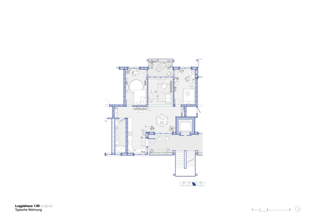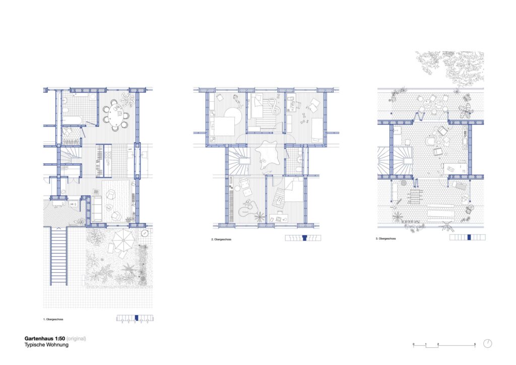 Located by the Residential Courtyard, this building offers 3–4 room apartments, accessed via exposed staircases. Each unit has a covered private loggia and a semi-public outdoor space in front of the entrance, encouraging interaction with the immediate neighbors. Garden areas in the courtyard are shared by the units served by the same staircase. The plan provides basic infrastructure—water and electricity—but the design of these gardens is left to the residents. Parking is located in the basement.