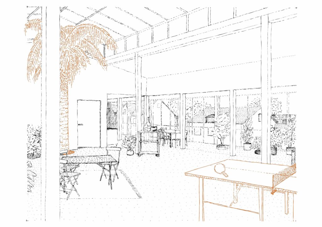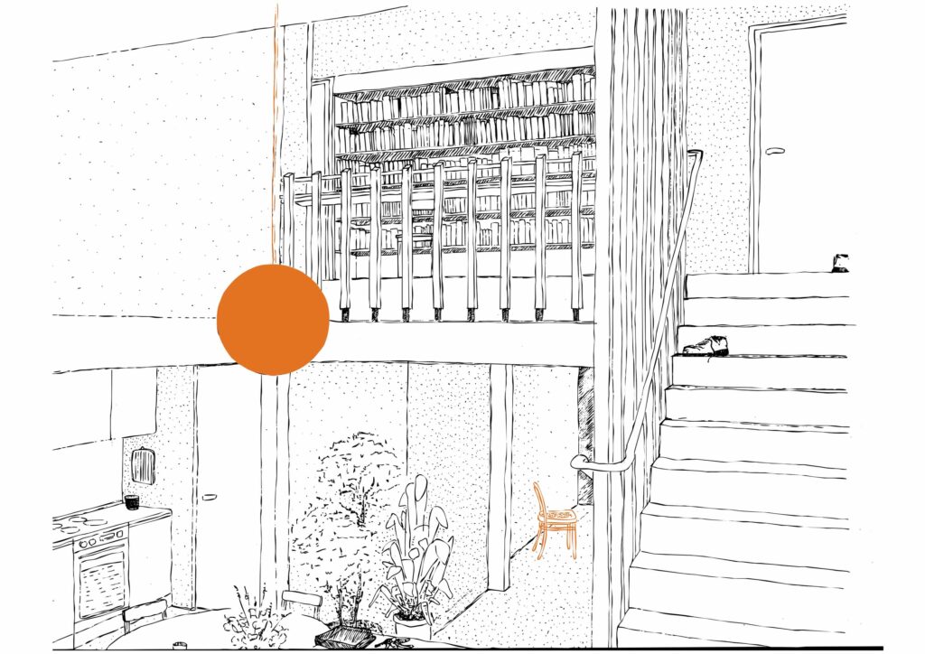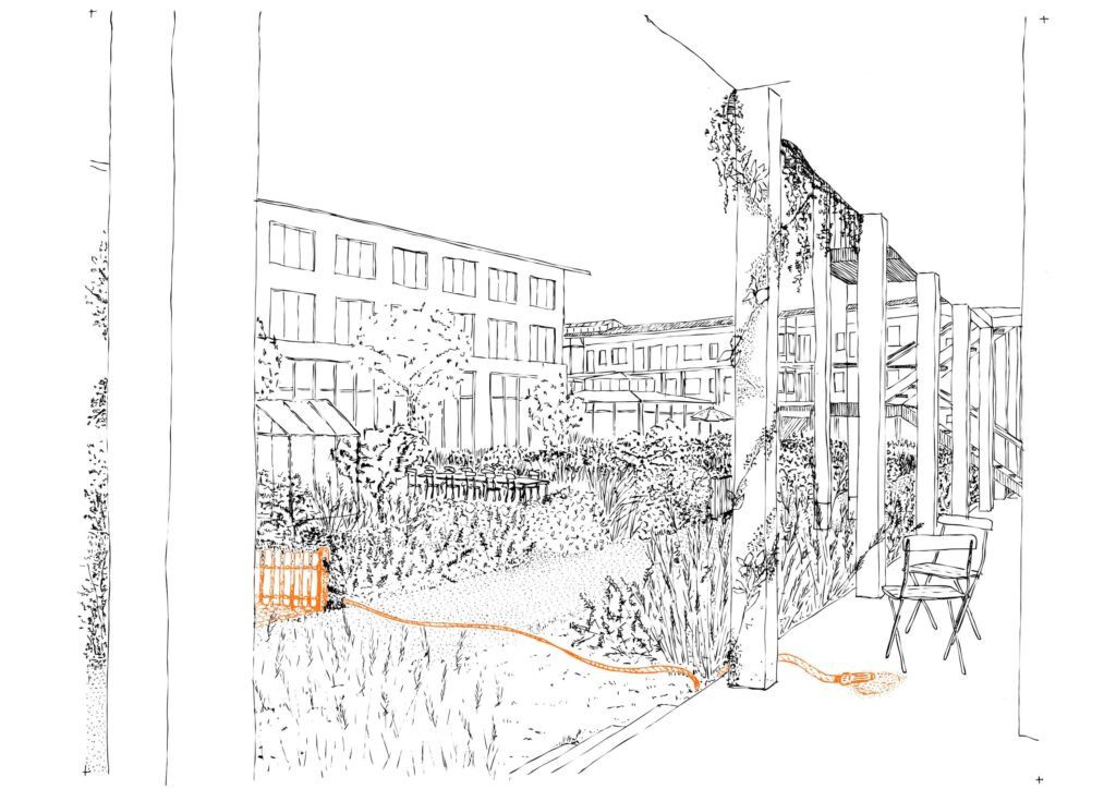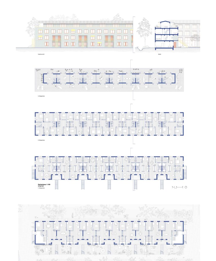 The ground floor of this building contains the supermarket entrance and additional retail spaces facing the Market Square. On the side of the courtyard and the green strip, flexible-use units with mezzanines and high glass façades offer ample light and can be used for commercial purposes, sports facilities, live/work studios, etc. The maisonette apartments above are accessed via the rooftop garden that sits on top of the supermarket and offer three-room units of medium size. They celebrate two-level living reminiscent of a detached house, while also offering immediate access to a private garden. A reinterpretation of the traditional allotment garden provides 30 garden plots for 20 units, to be distributed as needed, and includes a shared building for tools, events, and guests. This is made possible by structurally reinforcing and rebuilding the supermarket’s roof.