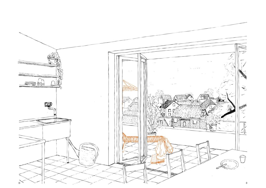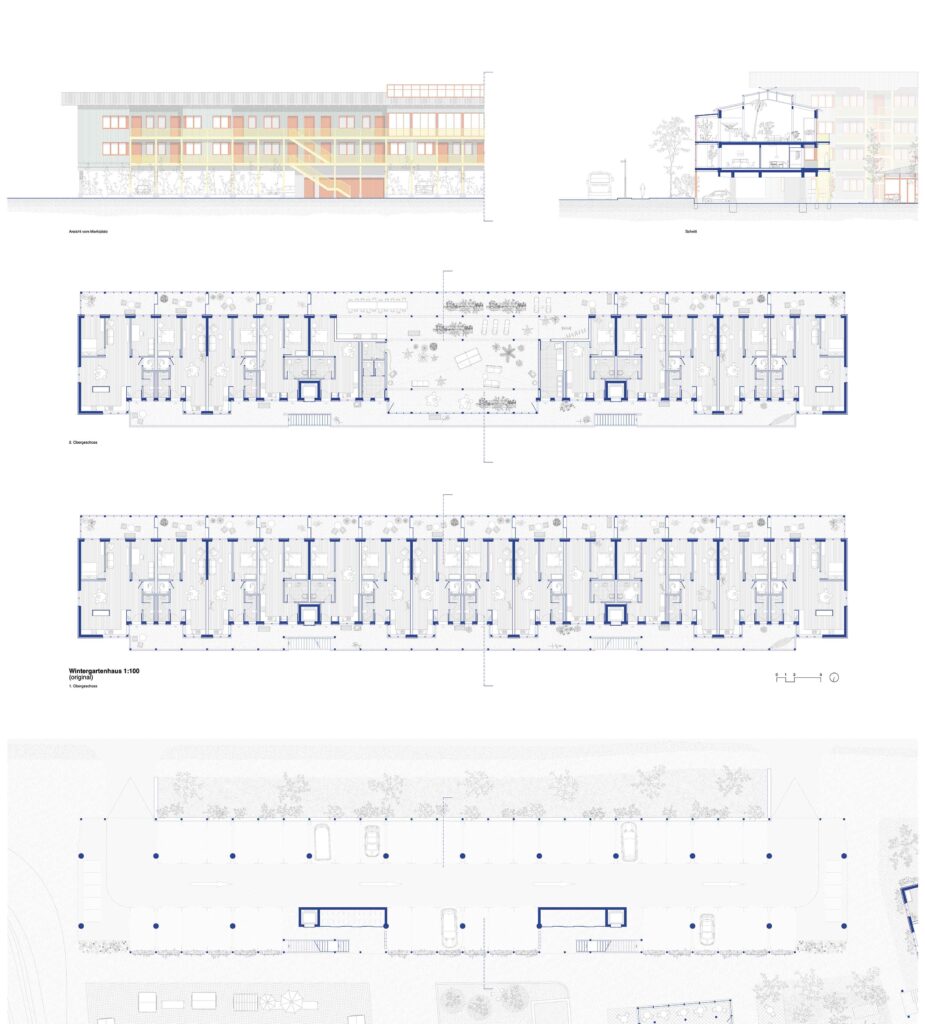 Facing the village street, this building contains the smallest units, accessed via an external corridor. A private winter garden acts as a buffer against traffic noise and represents the most urban interpretation of a garden. Where the apartment sizes are smallest, the sense of community is strongest: residents share a large communal winter garden on the top floor, complete with a shared kitchen, laundry area, and two flexible-use units. The open ground floor serves as a parking area for supermarket customers during the day and residents at night. With a ceiling height of 3.5 meters, it can later be converted into retail units.