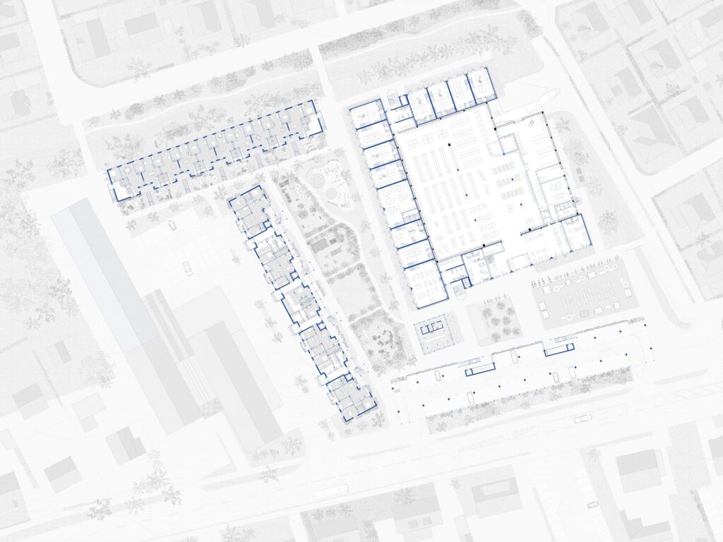 On a central site in town, near the Berlin city border, three elongated residential buildings and a redevelopment of an existing supermarket form a new ensemble. Three porous, programmatically distinct courtyards—Market Square, Residential Courtyard, and Rooftop Garden—structure the complex.